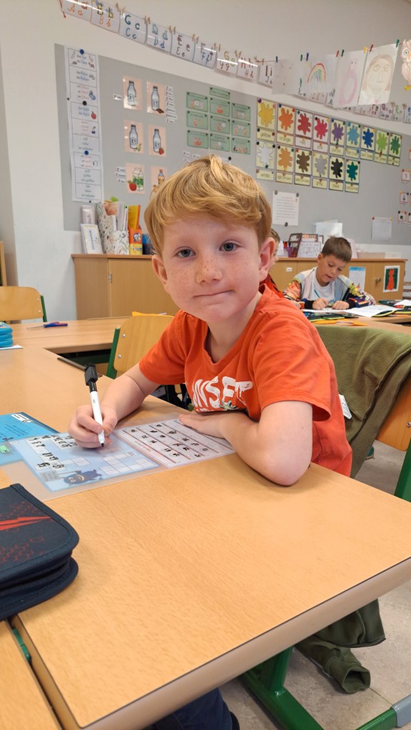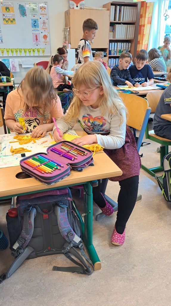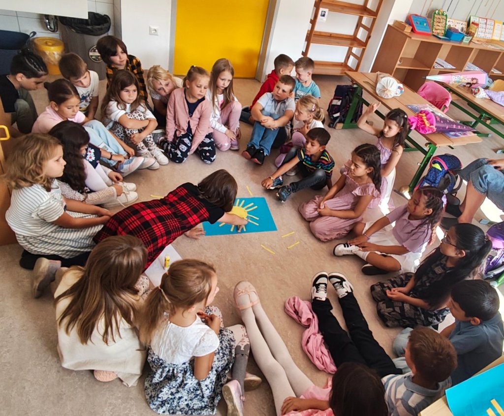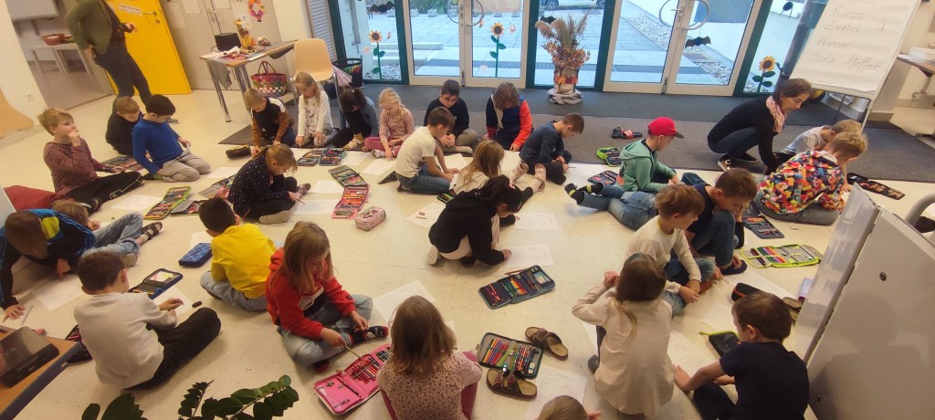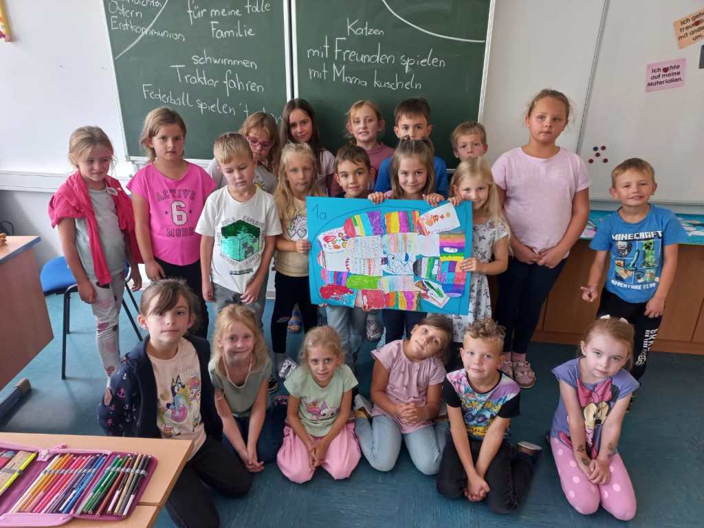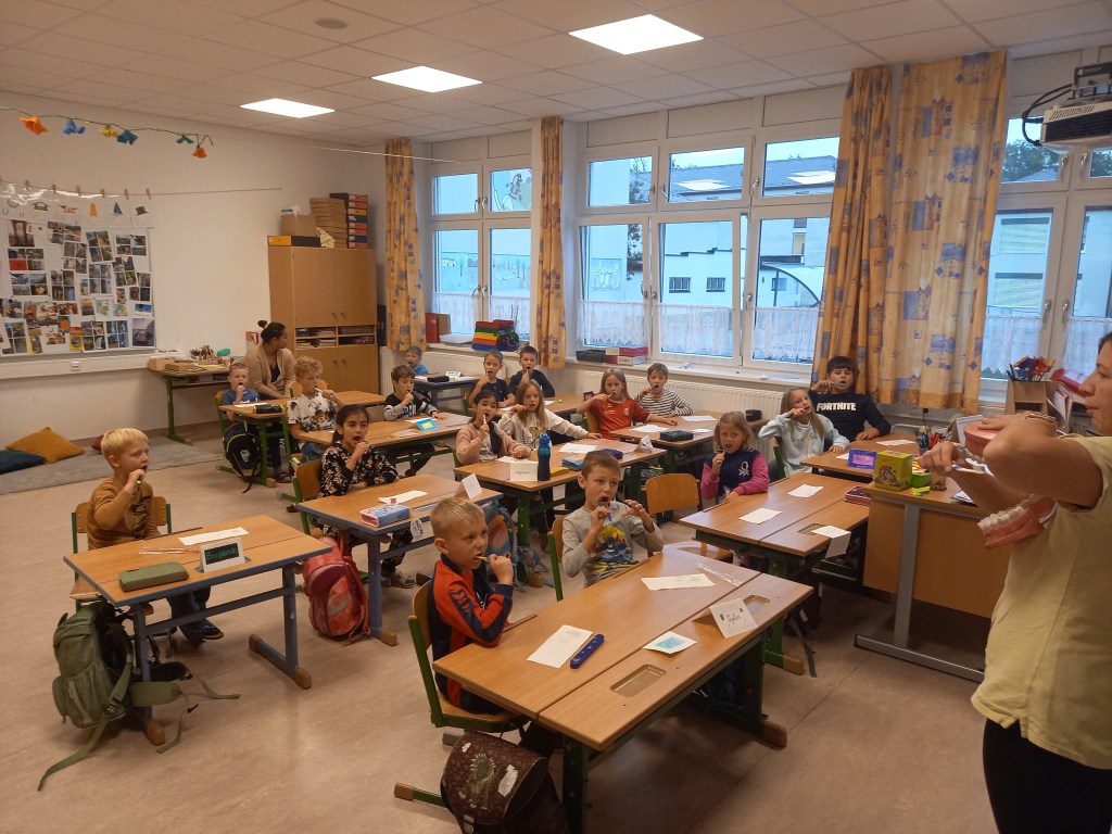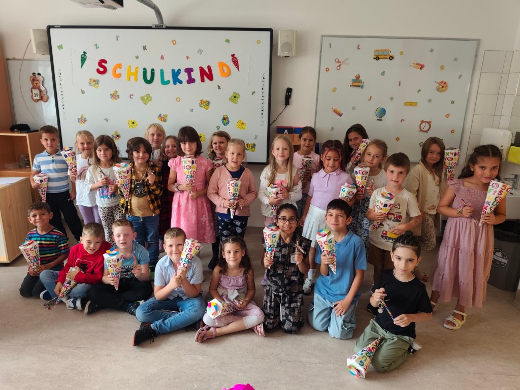Am 1. September starteten 25 Schulkinder in der 1b Klasse ihre Schullaufbahn. Zum Kennenlernen gestalteten wir eine Sonne mit den Namen der Kinder als Sonnenstrahlen. Als Belohnung für den gelungenen ersten Schultag gab es Schultüten für alle.