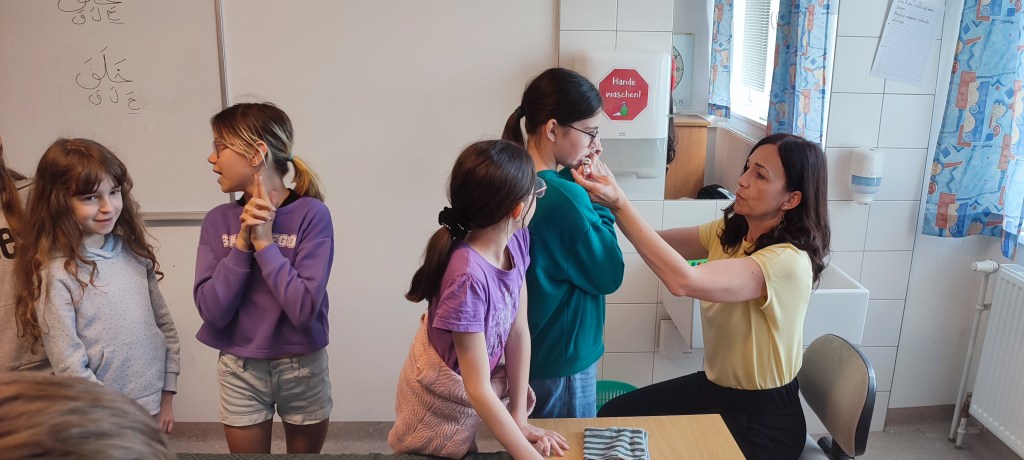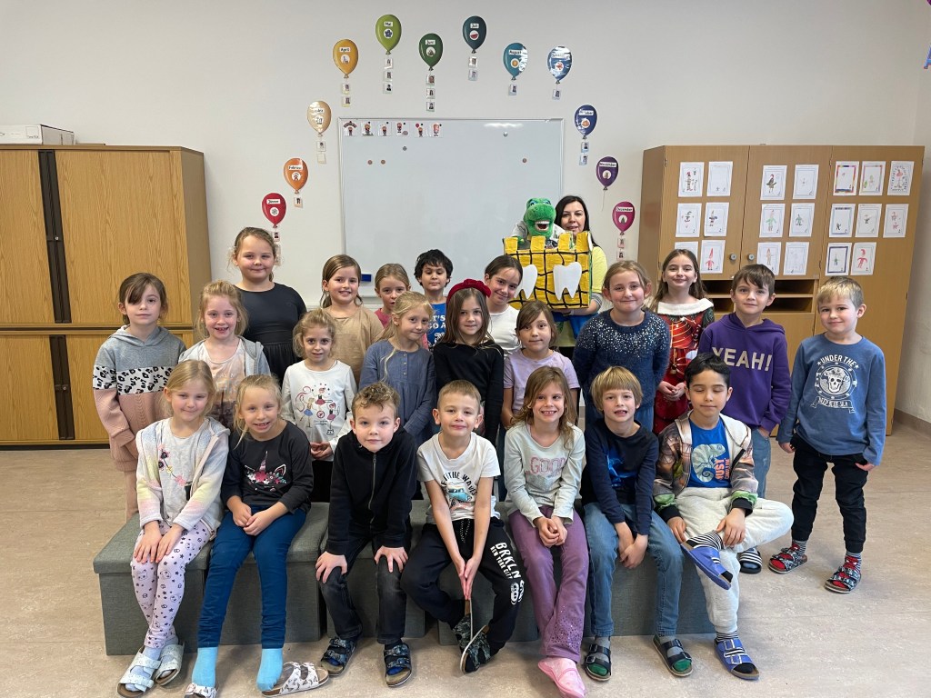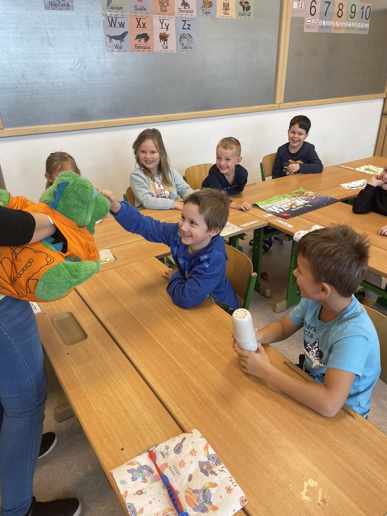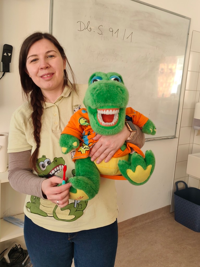 Mit der Zahngesundheitserzieherin Alexandra und ihrem Helfer Kroko übten wir das Zähneputzen und lernten viel über Mundhygiene.