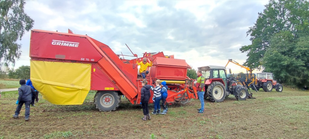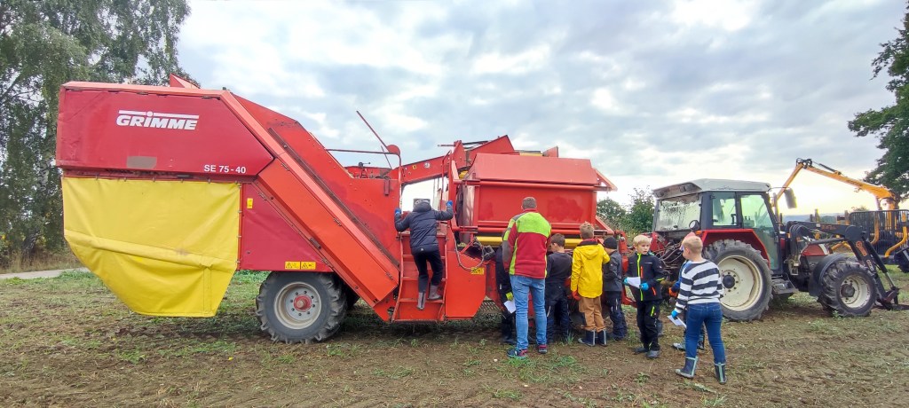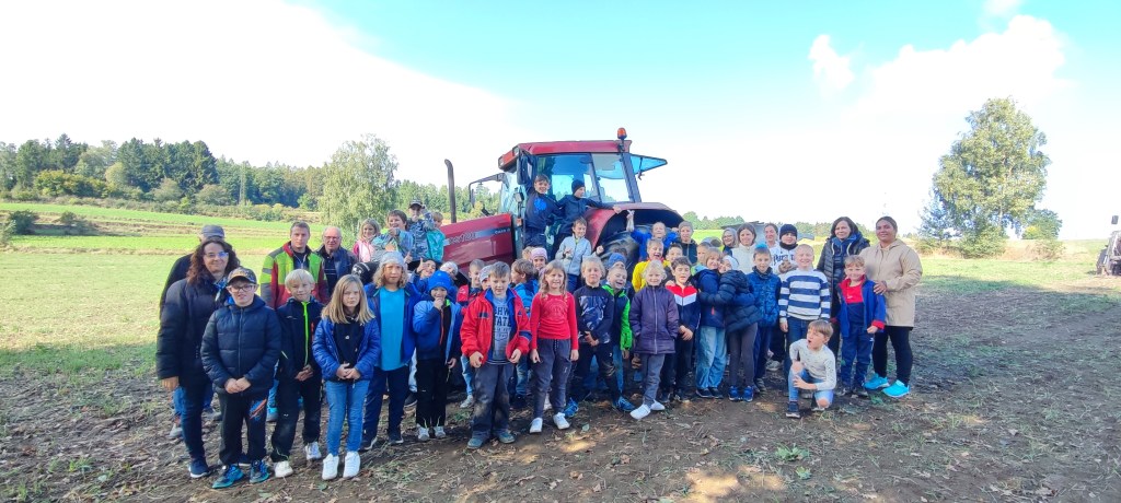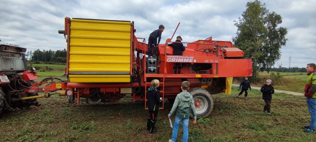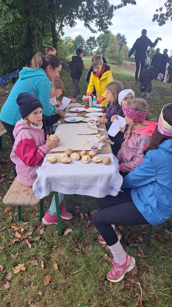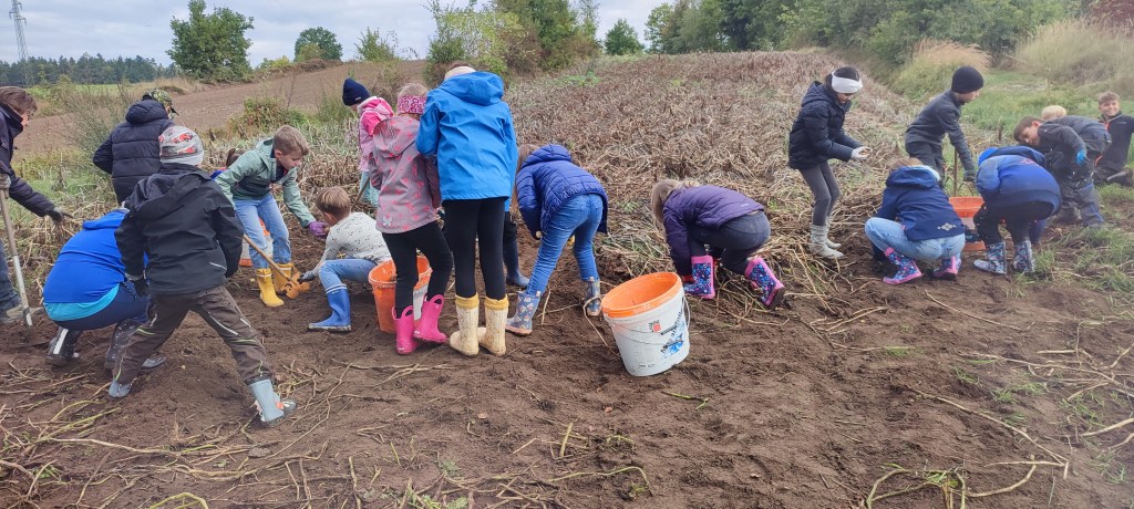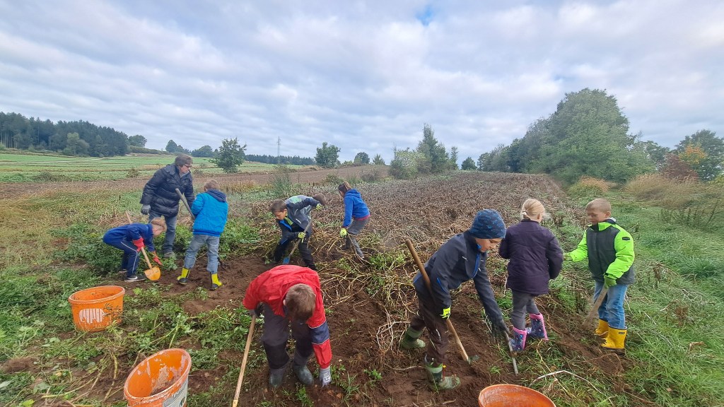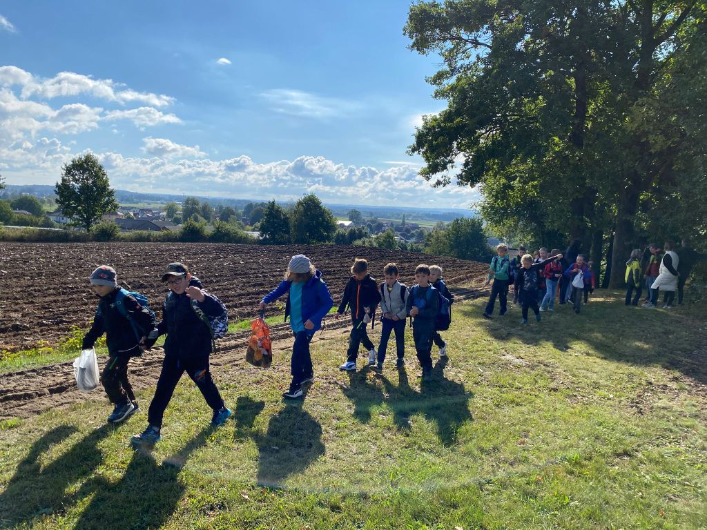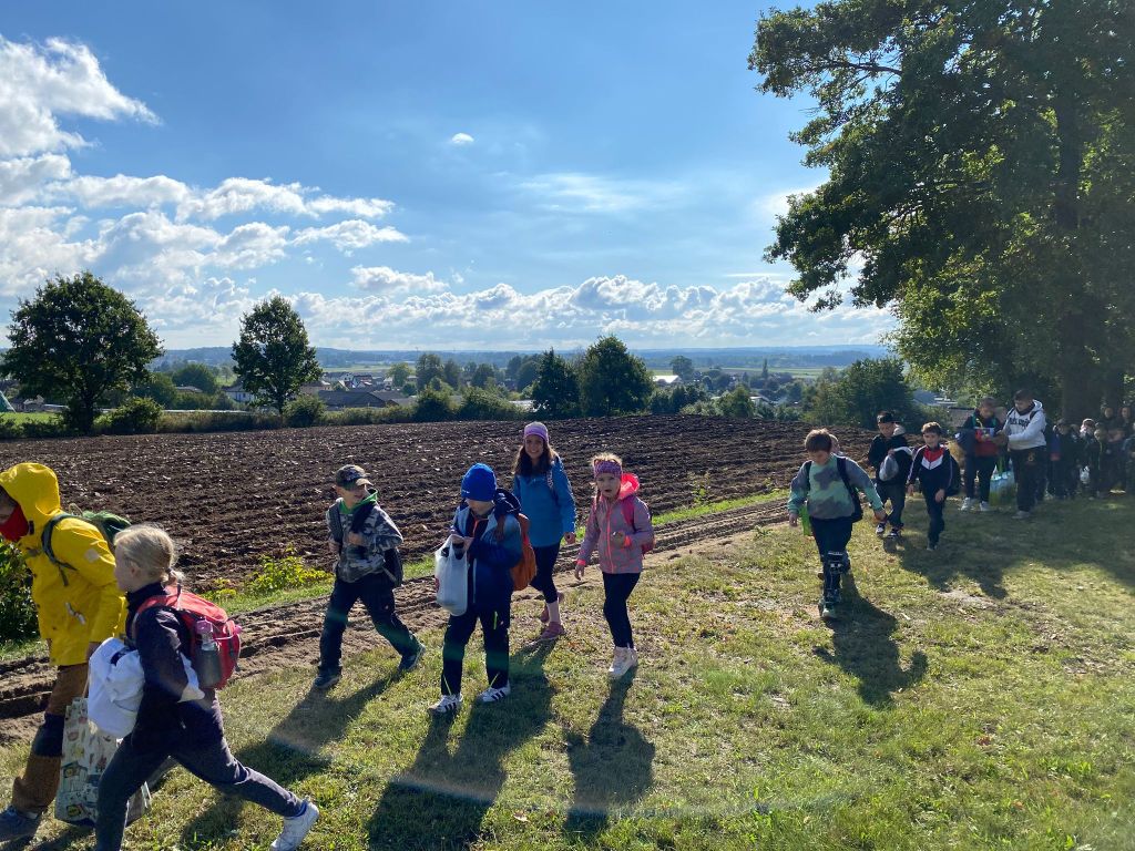 Wandertag nach Köttinghörmanns: Die Kinder der 3. Klassen durften bei Familie Brantner in Köttinghörmanns einen tollen Vormittag verbringen. Bei 4. Stationen konnten die Kinder wissenswertes zur Erdäpfel lernen, ein Klassensackerl mit Erdäpfelstempel bedrucken, Eräpfelerntemaschinen kennenlernen und auch Erdäpfel ernten dürfen. Zum Abschluss wurden die Erdäpfel in Folien gewickelt, im Lagerfeuer zubereitet und verspeist. Die Kinder waren begeistert und hatten jede Menge Spaß.