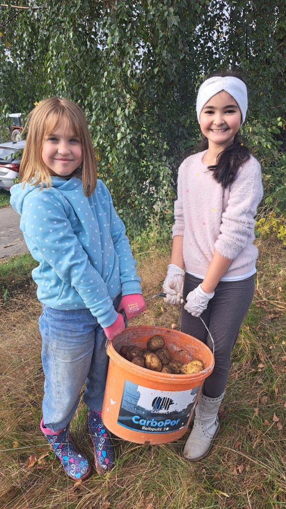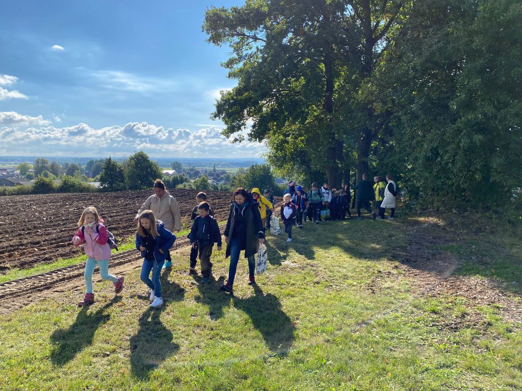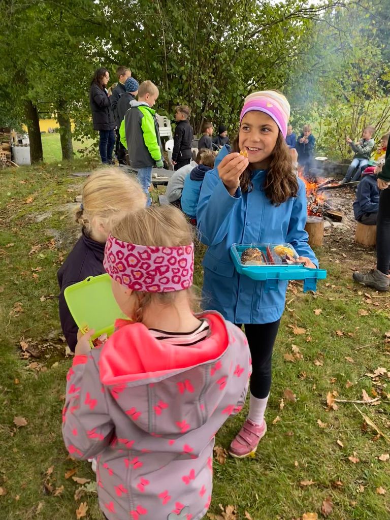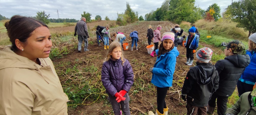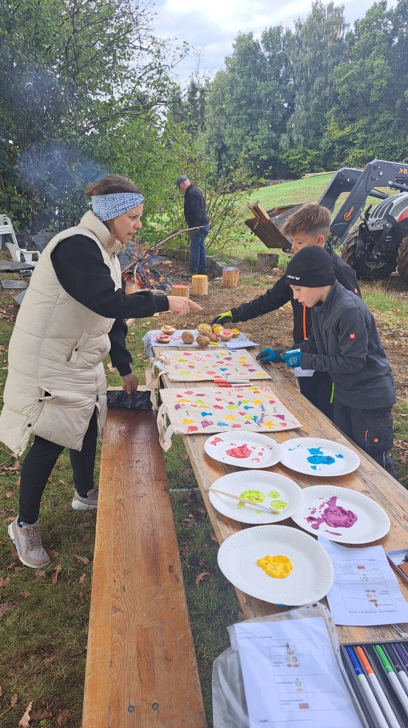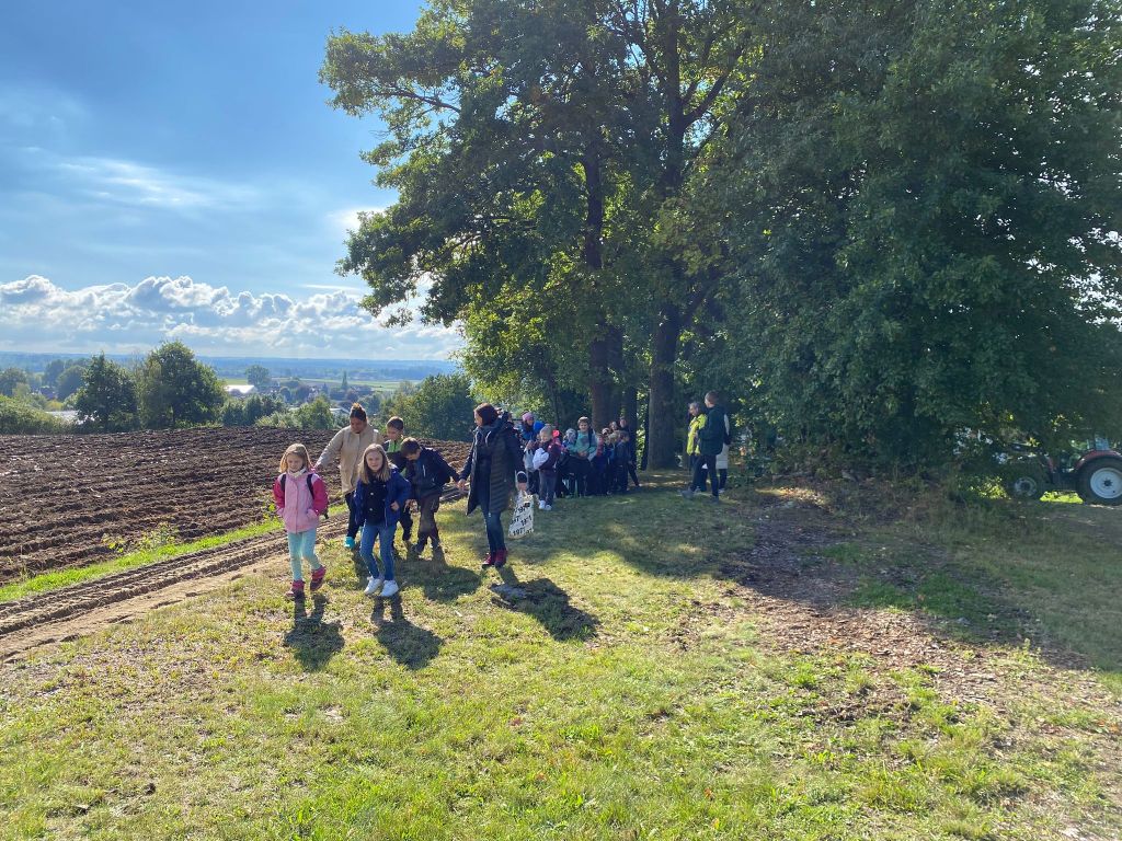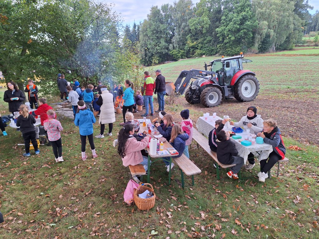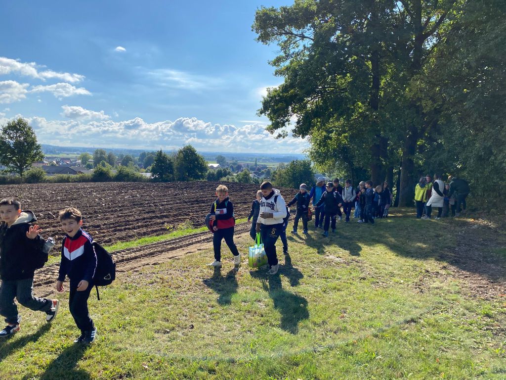 Wandertag nach Köttinghörmanns: Die Kinder der 3. Klassen durften bei Familie Brantner in Köttinghörmanns einen tollen Vormittag verbringen. Bei 4. Stationen konnten die Kinder wissenswertes zur Erdäpfel lernen, ein Klassensackerl mit Erdäpfelstempel bedrucken, Eräpfelerntemaschinen kennenlernen und auch Erdäpfel ernten dürfen. Zum Abschluss wurden die Erdäpfel in Folien gewickelt, im Lagerfeuer zubereitet und verspeist. Die Kinder waren begeistert und hatten jede Menge Spaß.