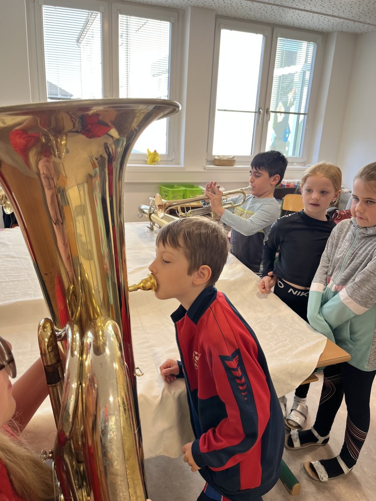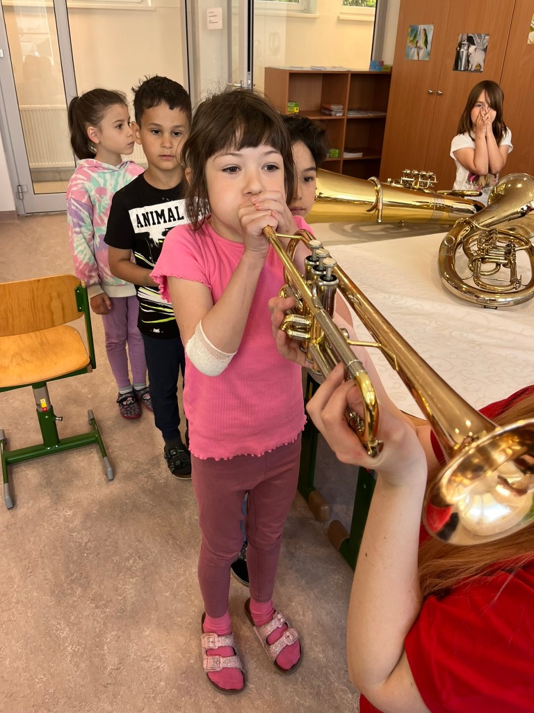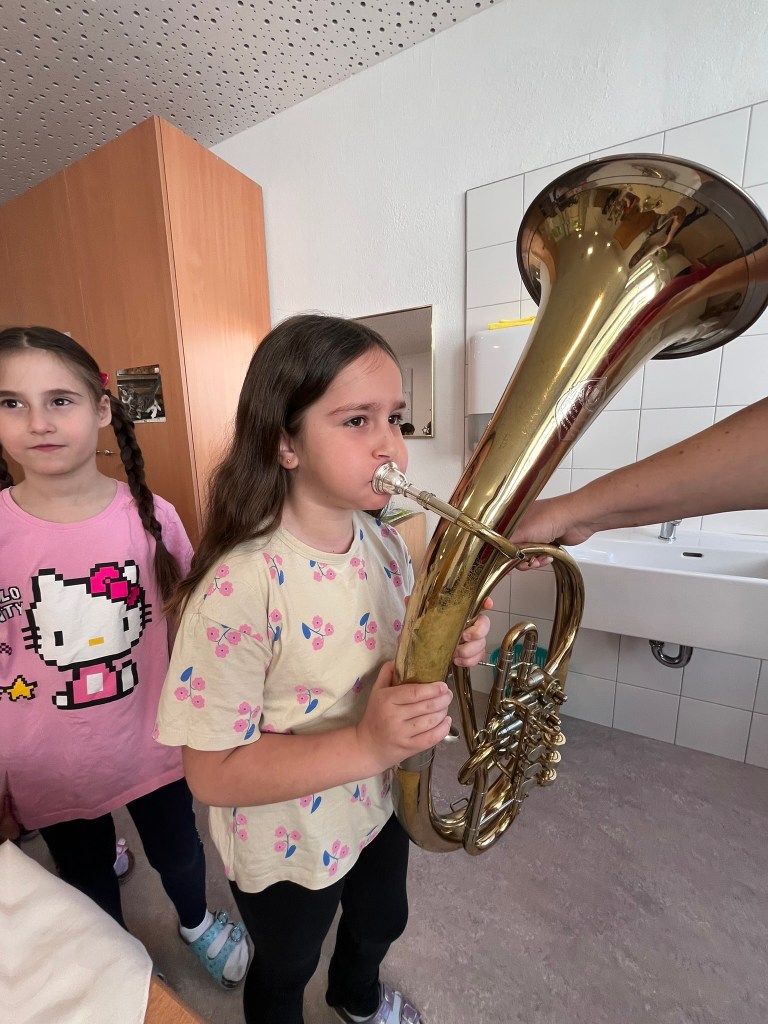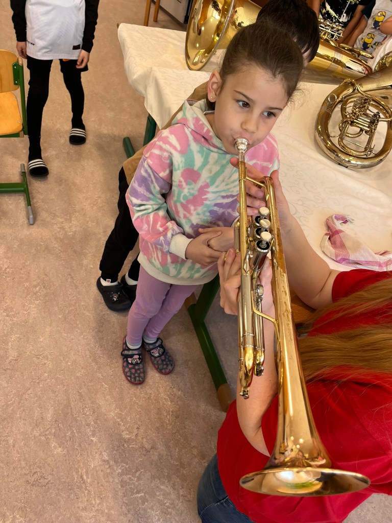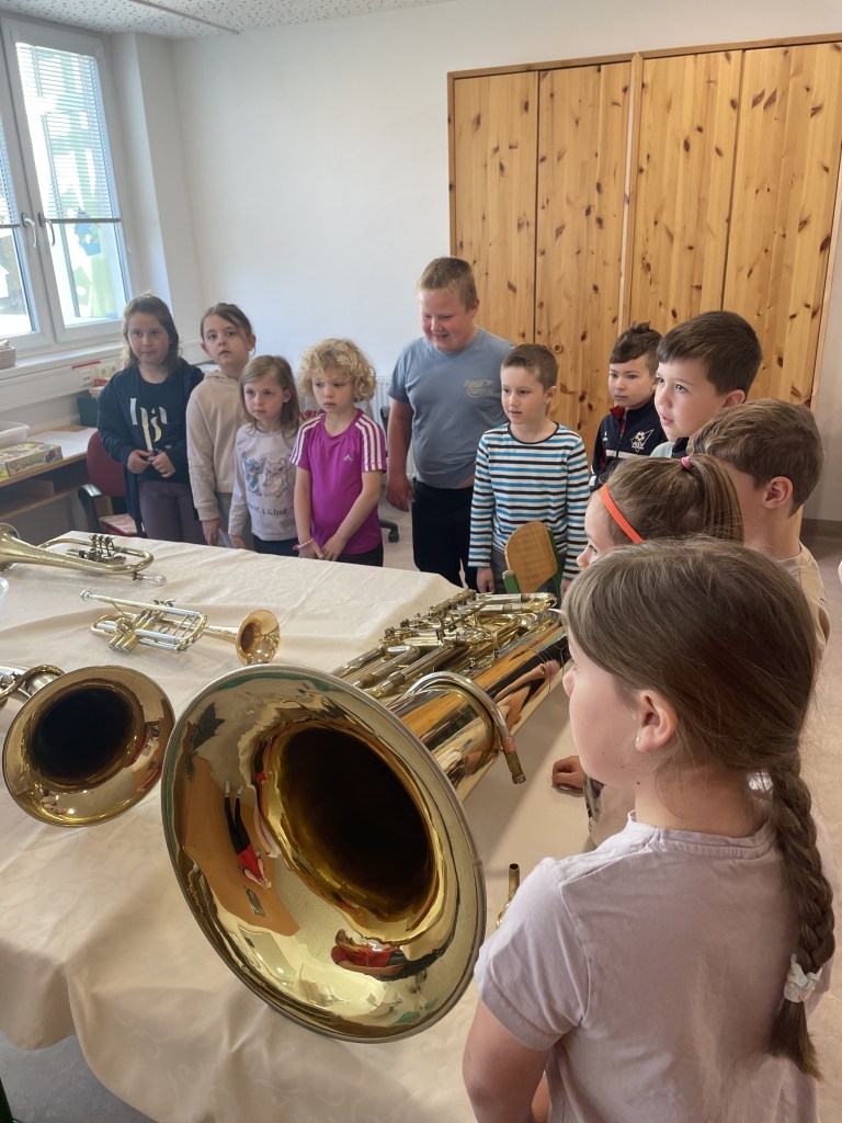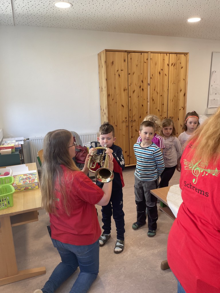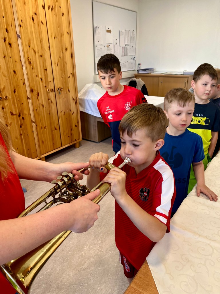 Am Dienstag, 30. April 2025, besuchte uns die Stadtkapelle Schrems. Die Kinder durften dabei einige Instrumente ausprobieren!