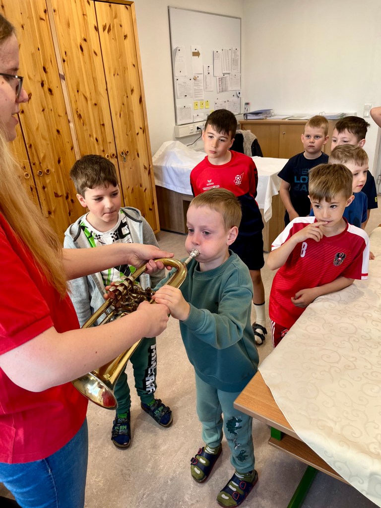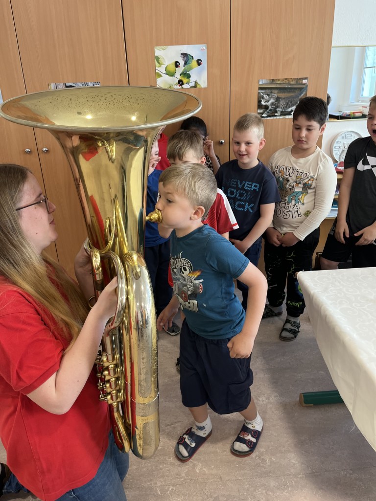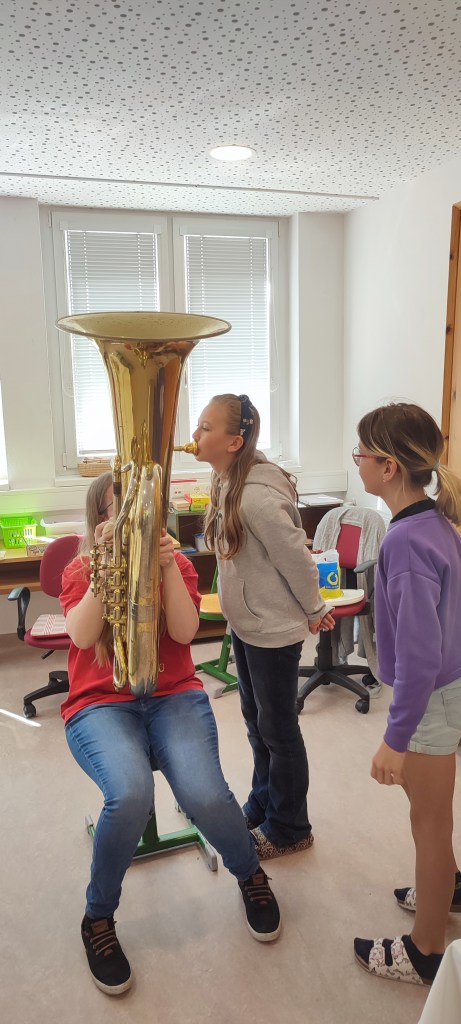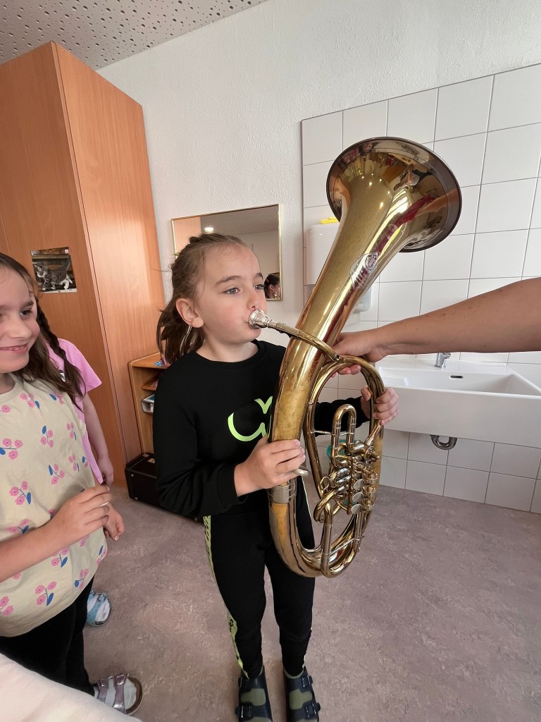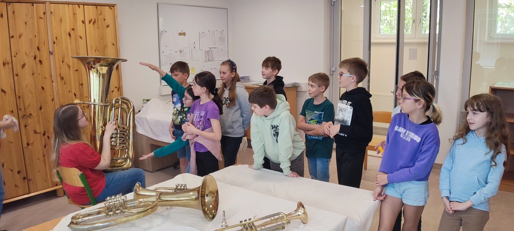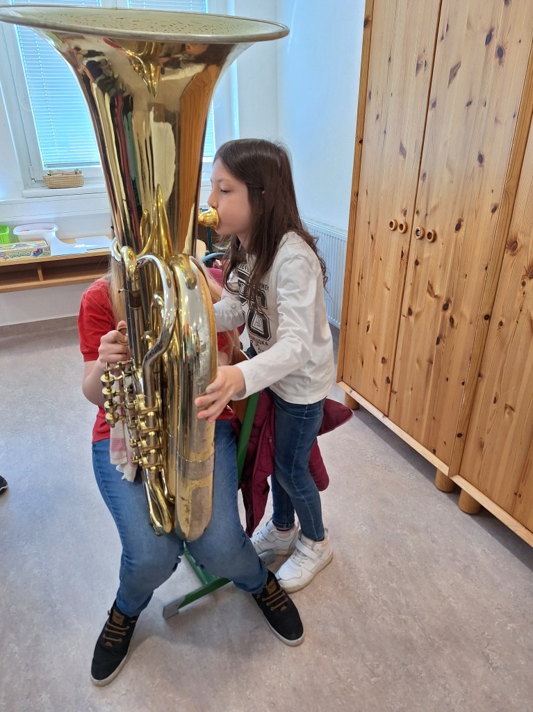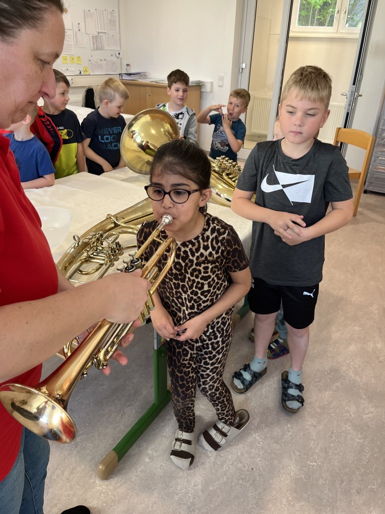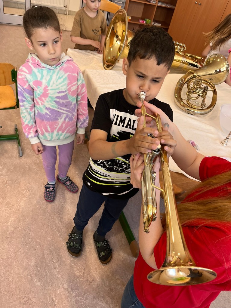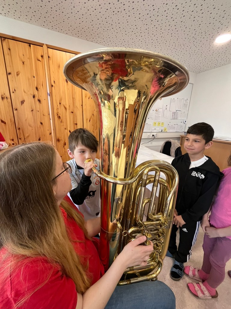 Am Dienstag, 30. April 2025, besuchte uns die Stadtkapelle Schrems. Die Kinder durften dabei einige Instrumente ausprobieren!