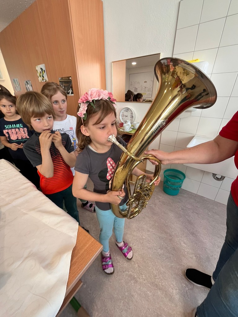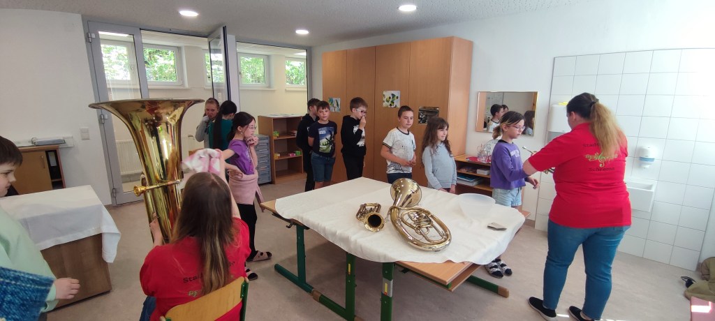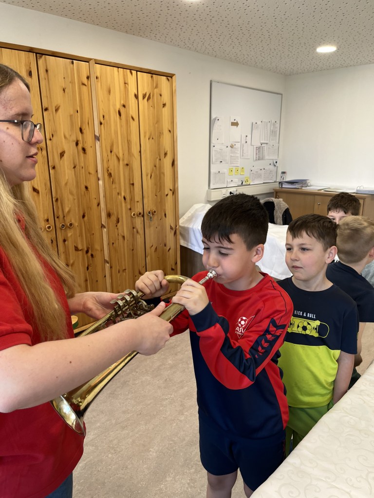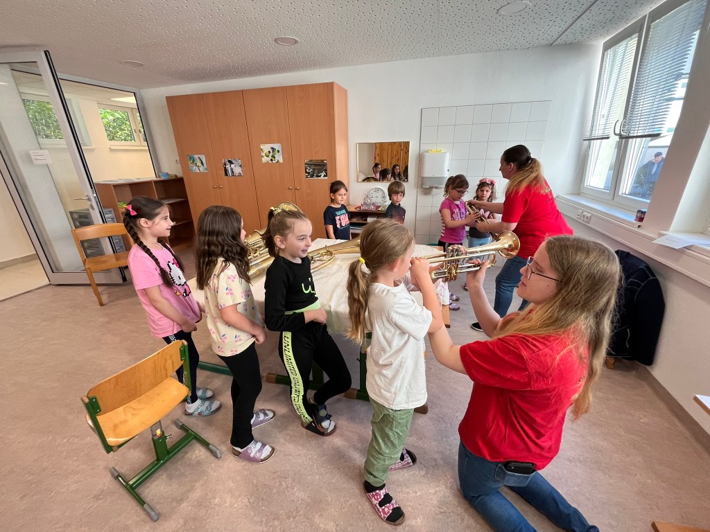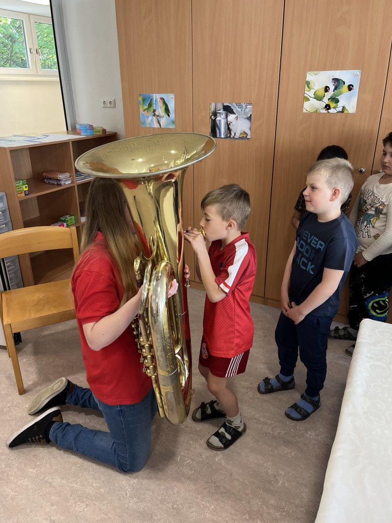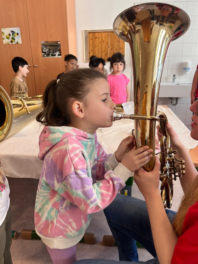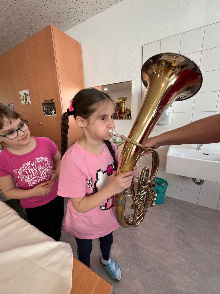 Am Dienstag, 30. April 2025, besuchte uns die Stadtkapelle Schrems. Die Kinder durften dabei einige Instrumente ausprobieren!