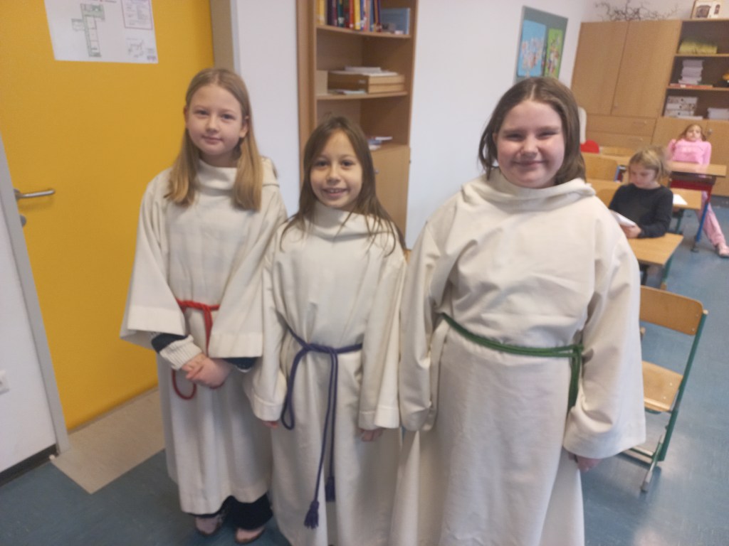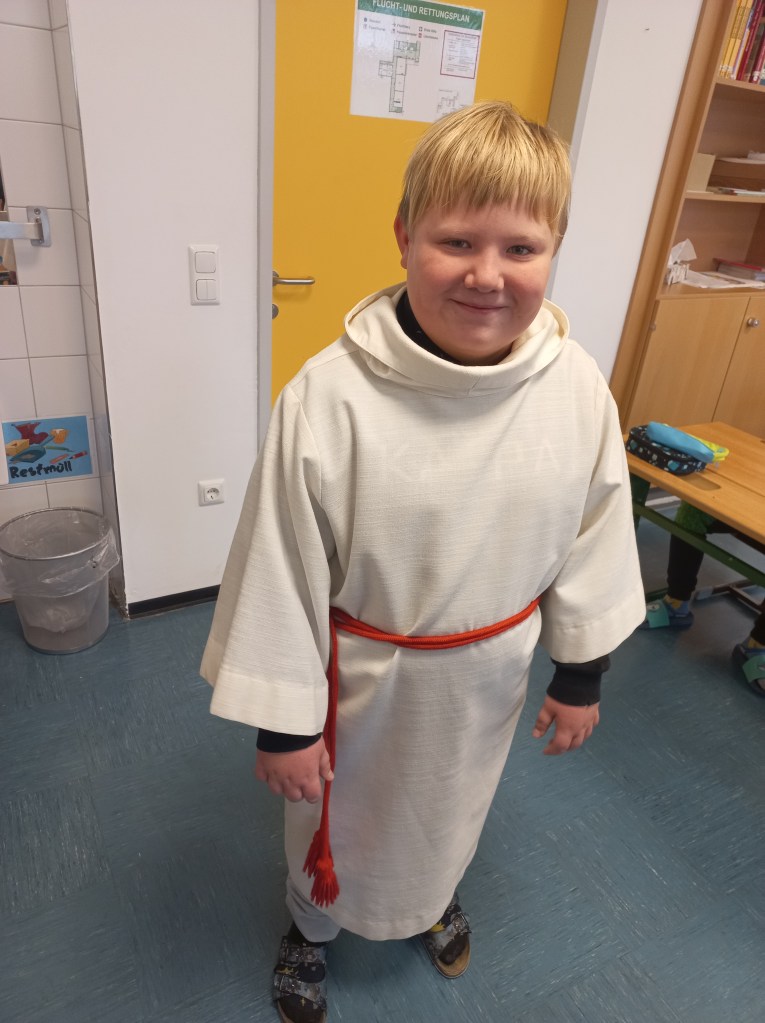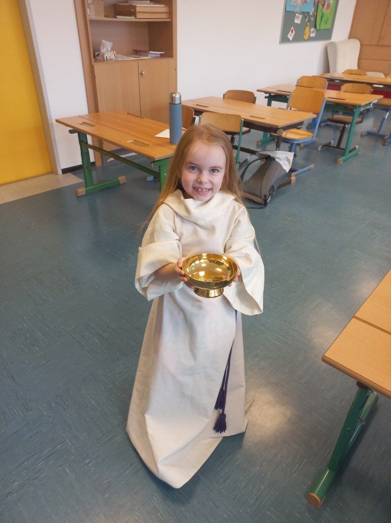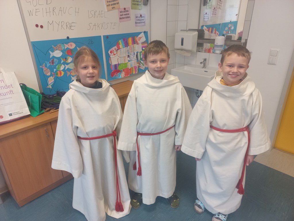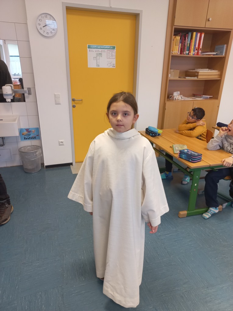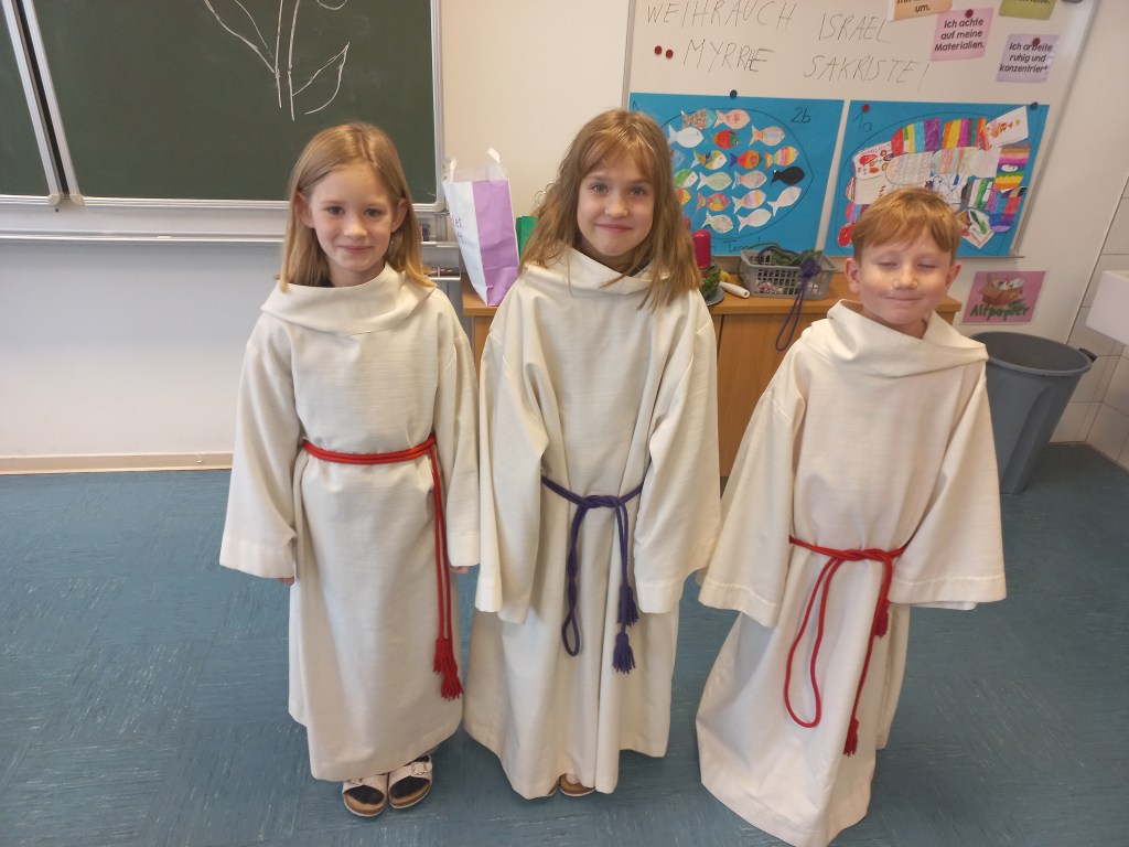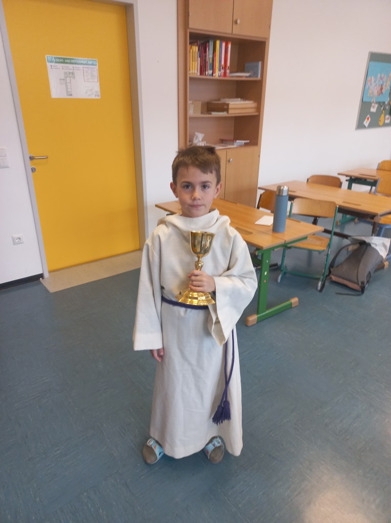 Die Schülerinnen und Schüler lernten wichtige liturgische Gegenstände wie Kelch, Glocken und Weihrauch kennen und erfuhren, welche Bedeutung sie im Gottesdienst haben. Ein besonderes Highlight war für viele das Anprobieren der Kutten, wodurch sie ganz praktisch erleben konnten, wie es sich anfühlt, selbst Ministrant/in zu sein.