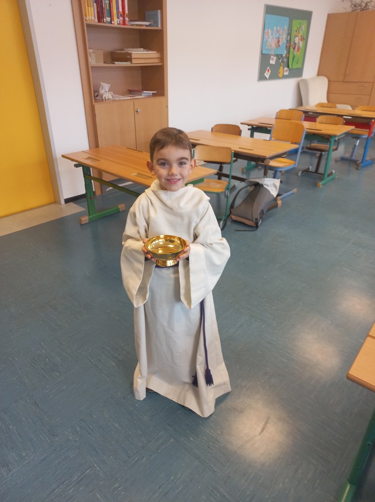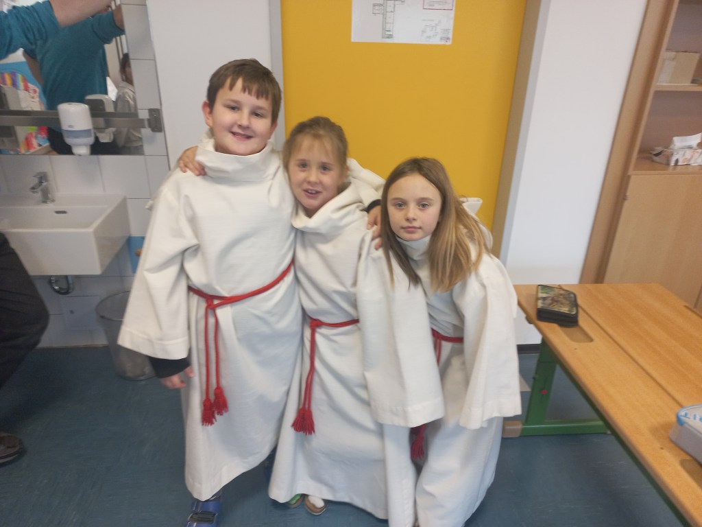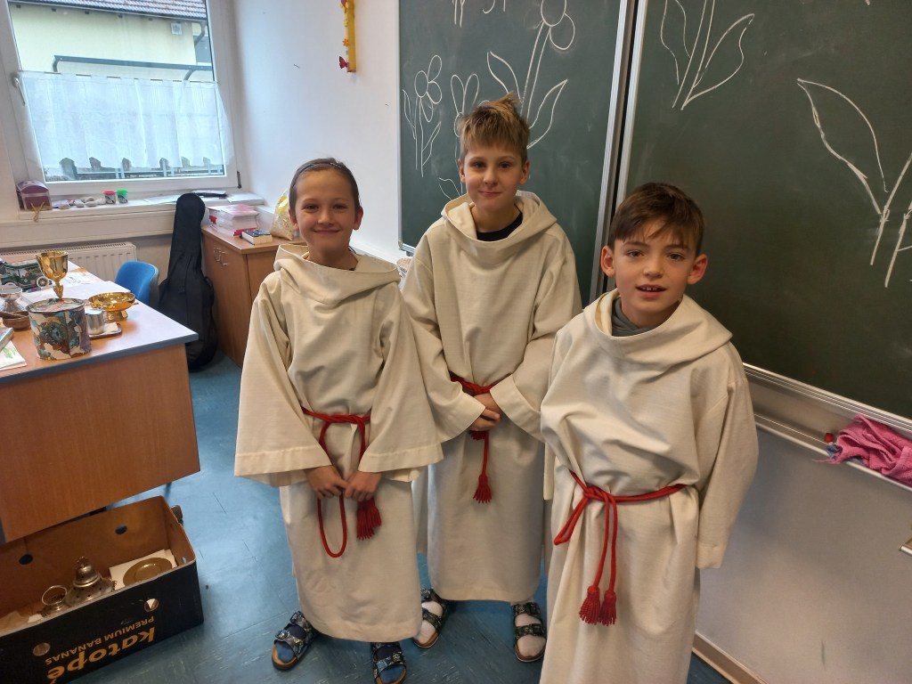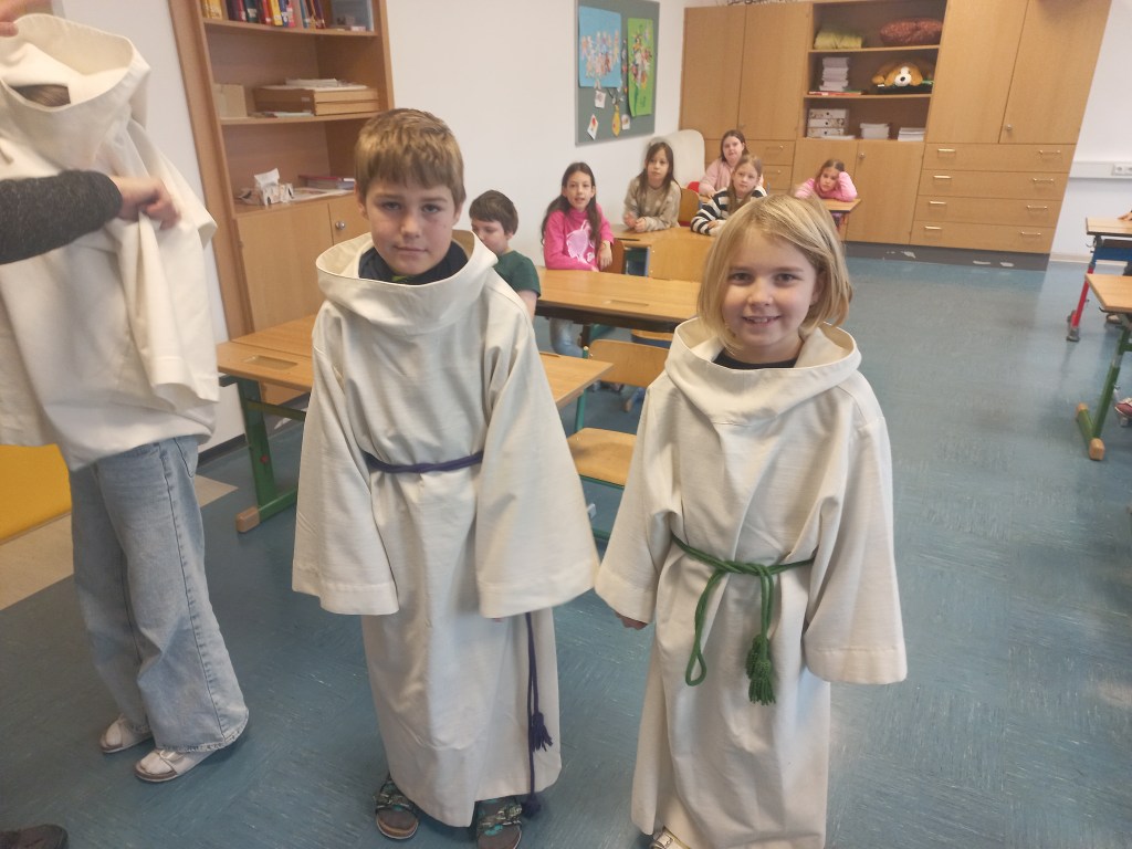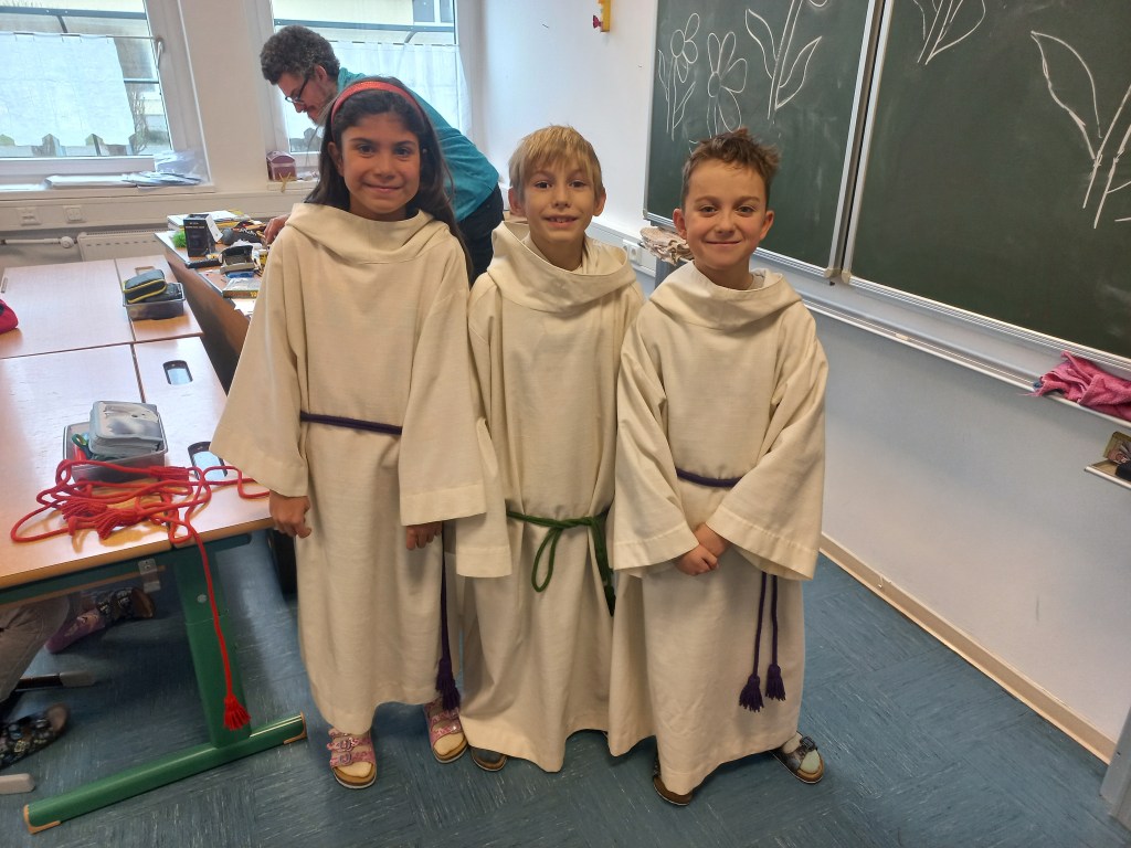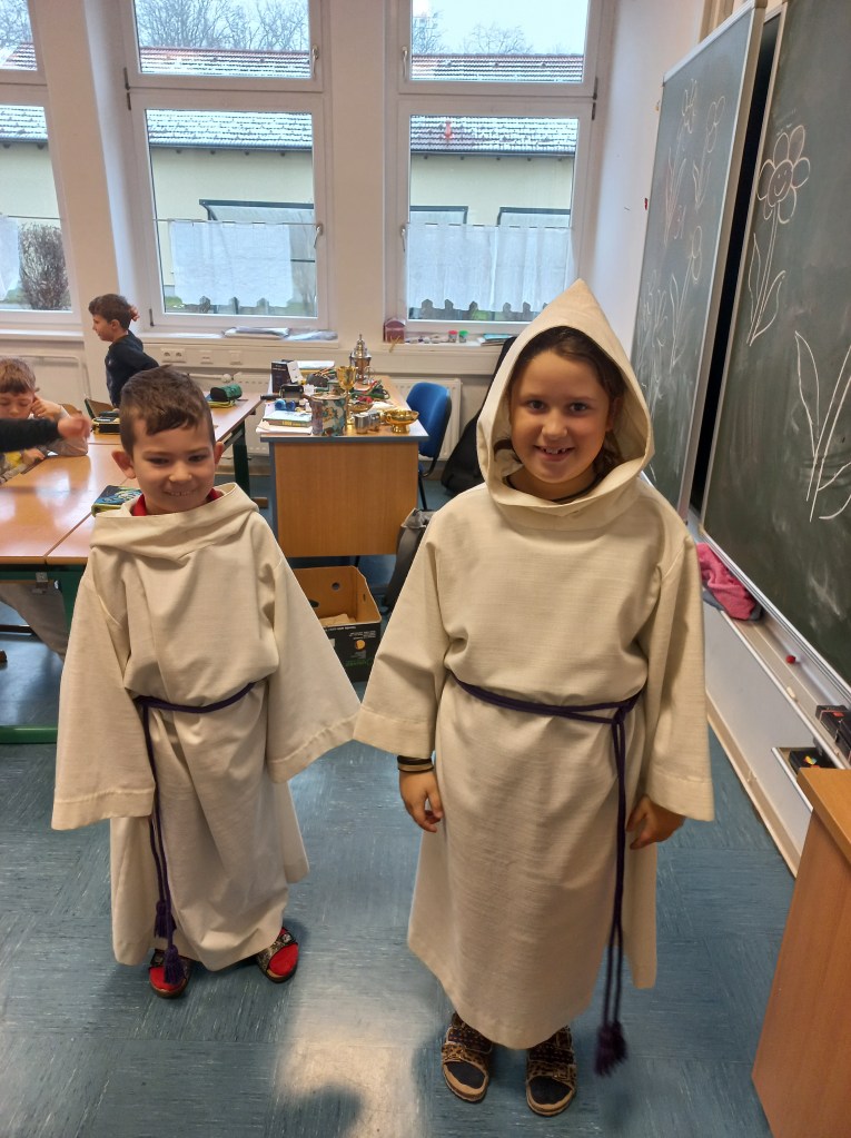 Die Schülerinnen und Schüler lernten wichtige liturgische Gegenstände wie Kelch, Glocken und Weihrauch kennen und erfuhren, welche Bedeutung sie im Gottesdienst haben. Ein besonderes Highlight war für viele das Anprobieren der Kutten, wodurch sie ganz praktisch erleben konnten, wie es sich anfühlt, selbst Ministrant/in zu sein.