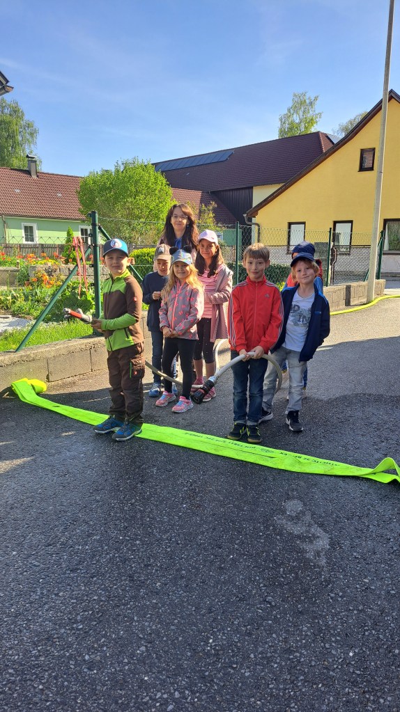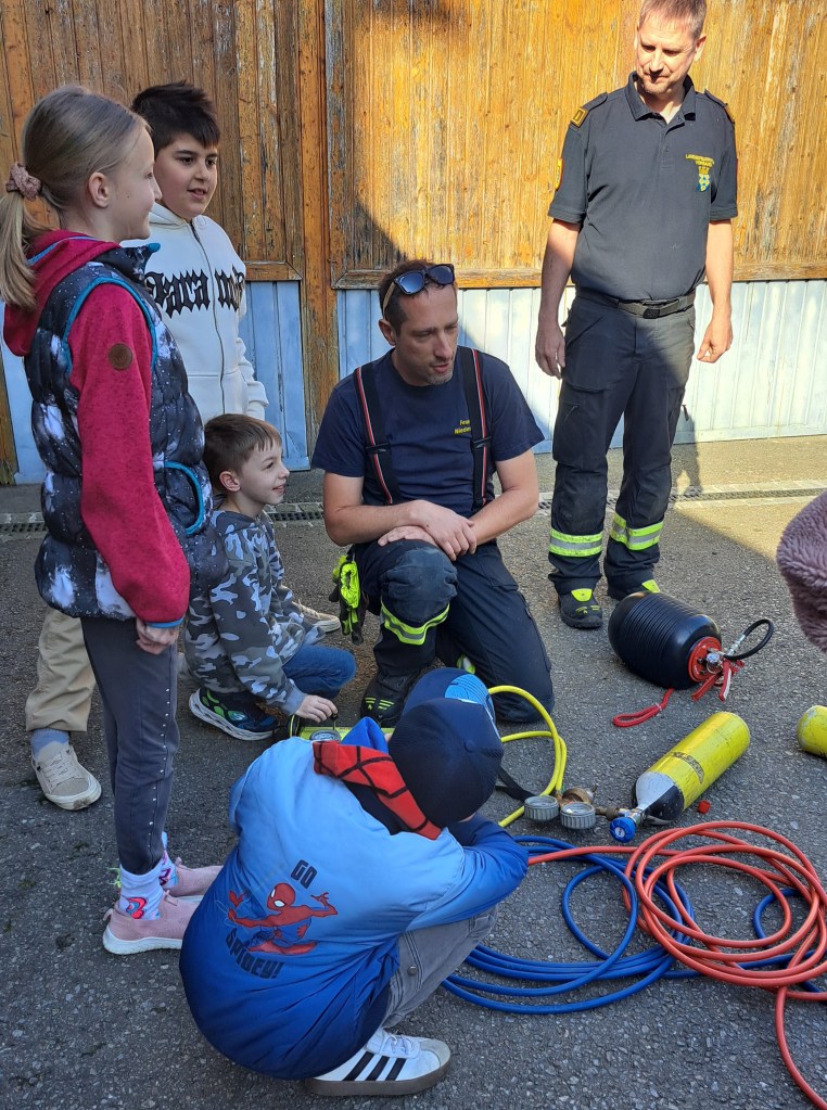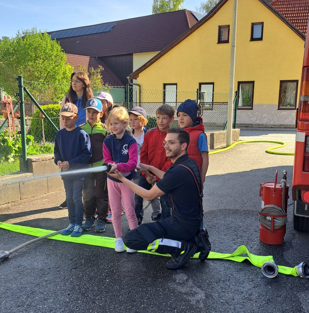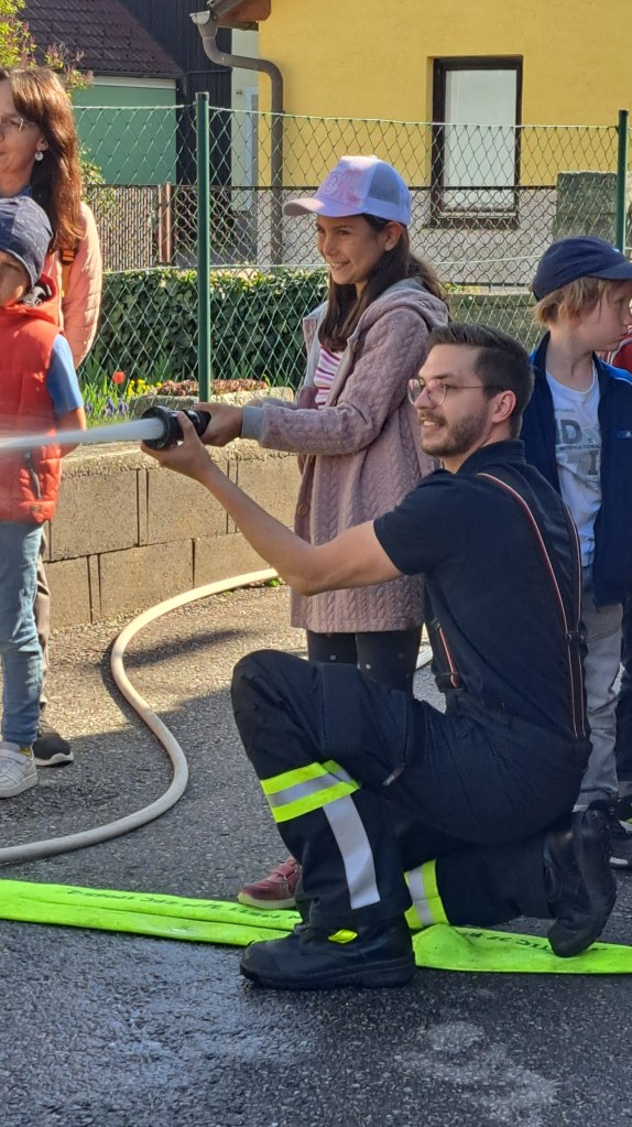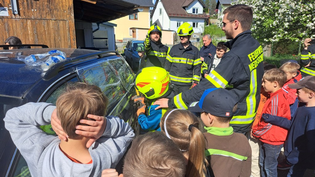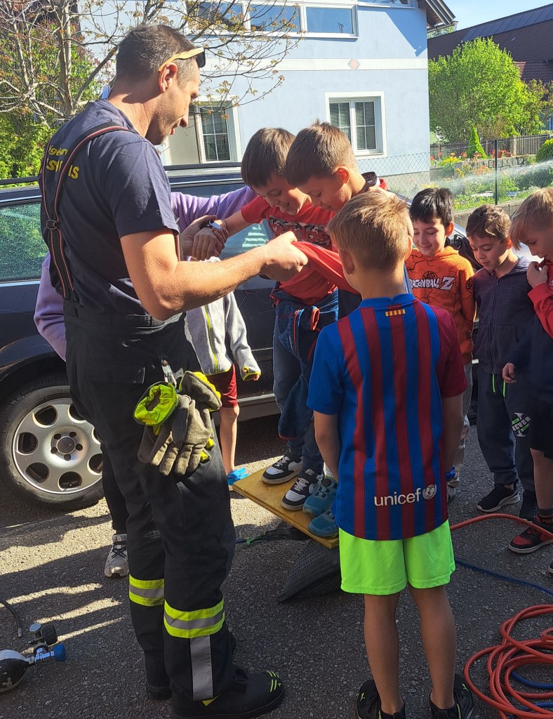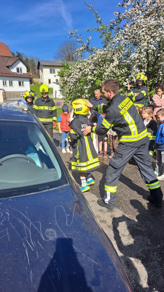 Am 30.April wanderten die 2. Klassen zur Feuerwehr nach Niederschrems. Die Freude war groß, als die Kinder die vorbereiteten Stationen sahen! Wir konnten die Feuerwehrausrüstung anprobieren, echtes Feuer mit dem Feuerlöscher löschen, mit dem Wasserschlauch auf ein Ziel spritzen, mit Hilfe des Hebekissens ein Auto hochheben und einiges mehr. Zuletzt durften wir sogar zusehen, wie eine Autotür mit der Hydraulischen Schere geöffnet wurde. Zur Stärkung gab es für alle großen und kleinen Feuerwehrfrauen und Feuerwehrmänner eine leckere Jause – herzlichen Dank für den spannenden und lehrreichen Vormittag!