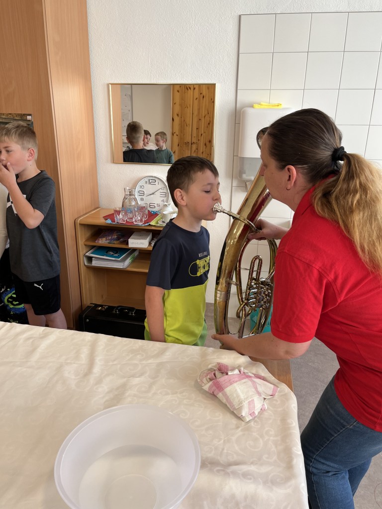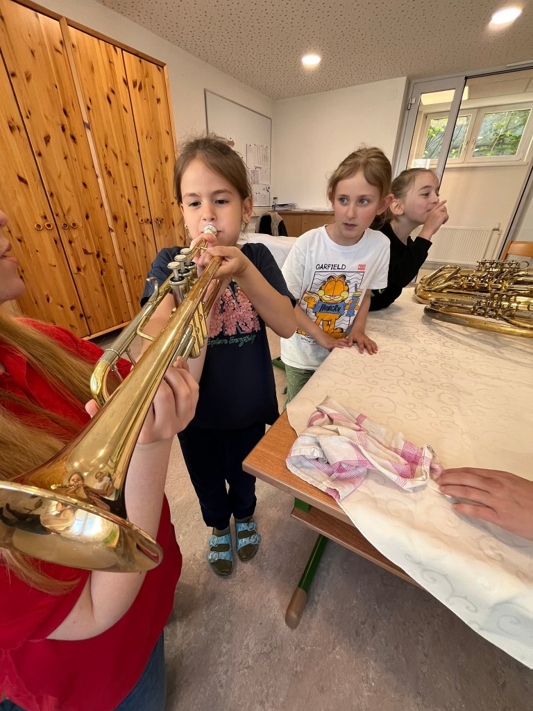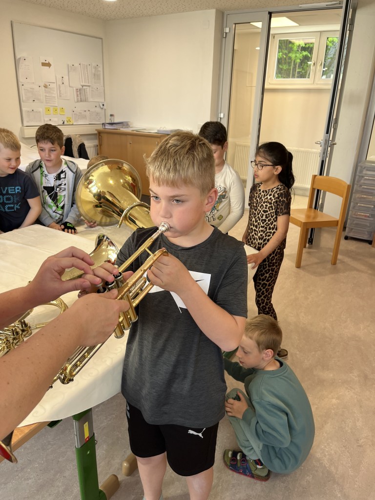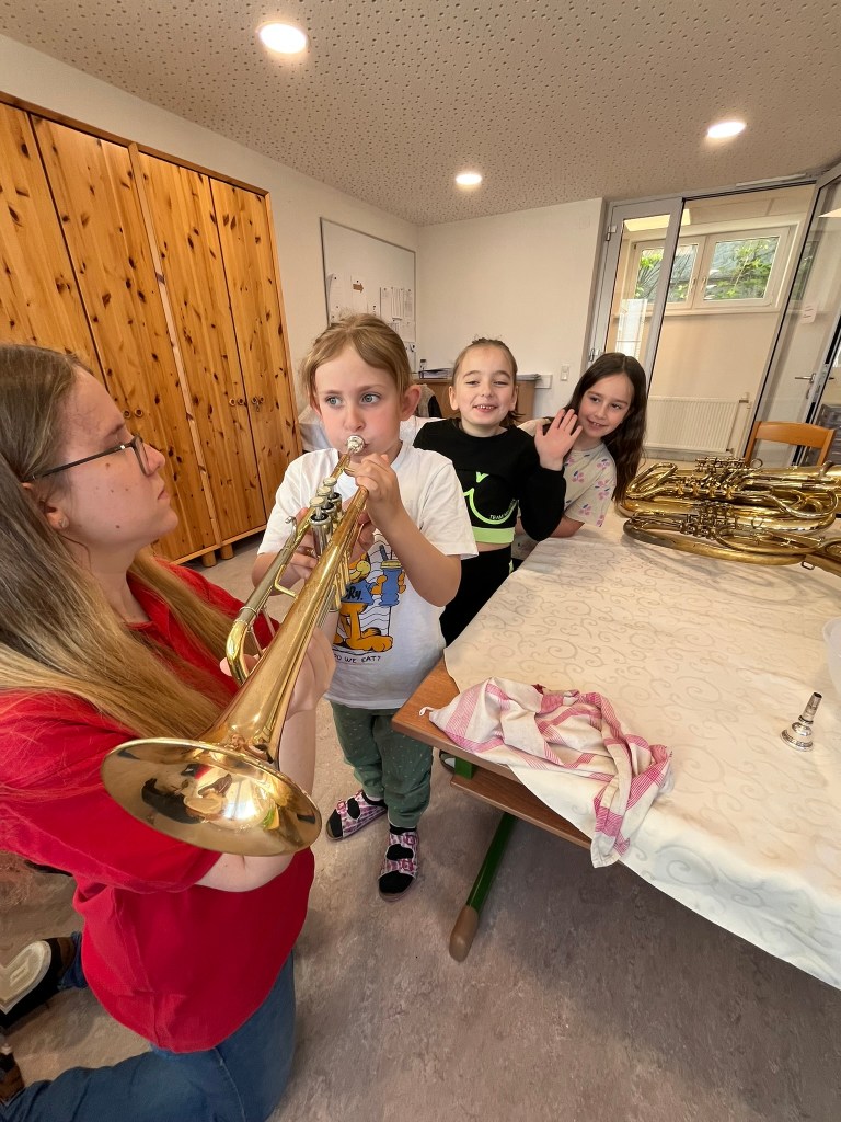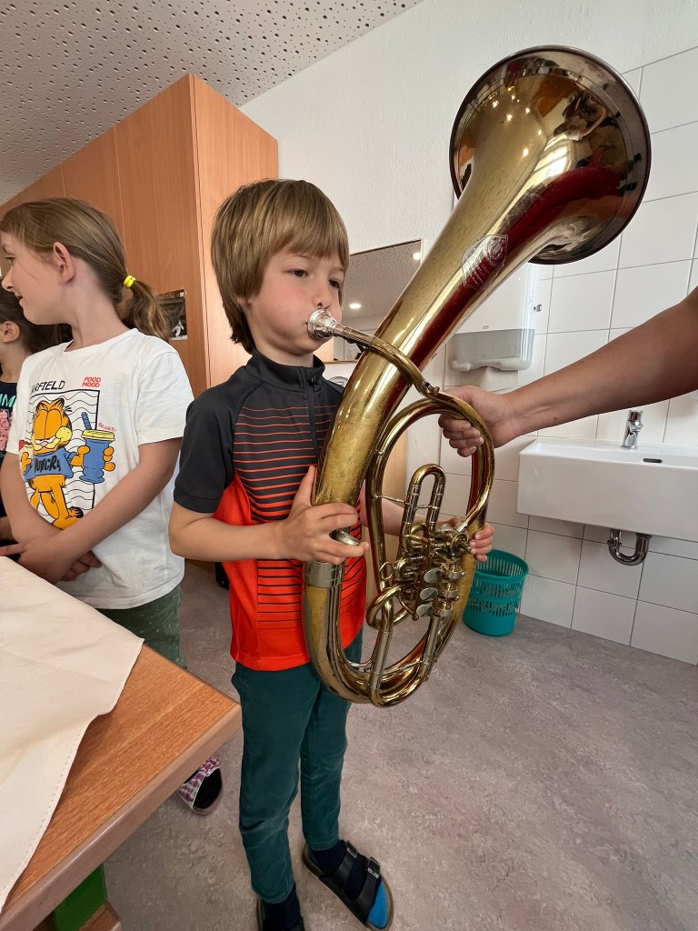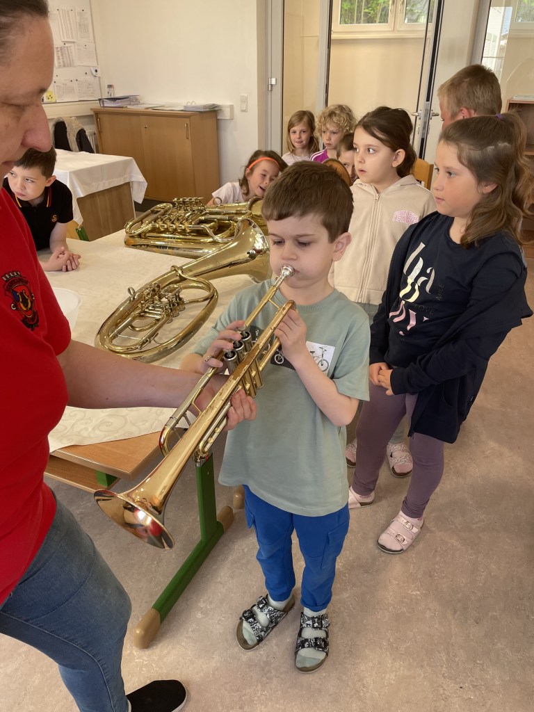 Am Dienstag, 30. April 2025 besuchte uns die Stadtkapelle Schrems. Die Kinder durften dabei einige Instrumente ausprobieren!