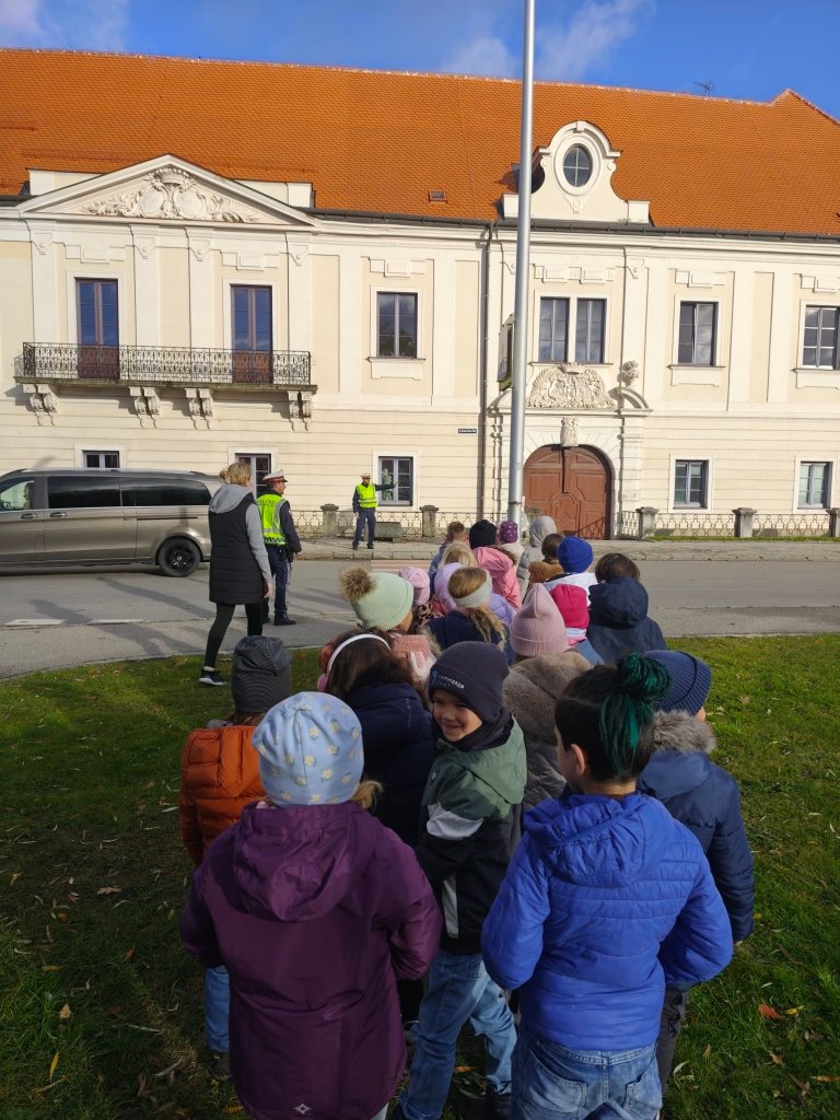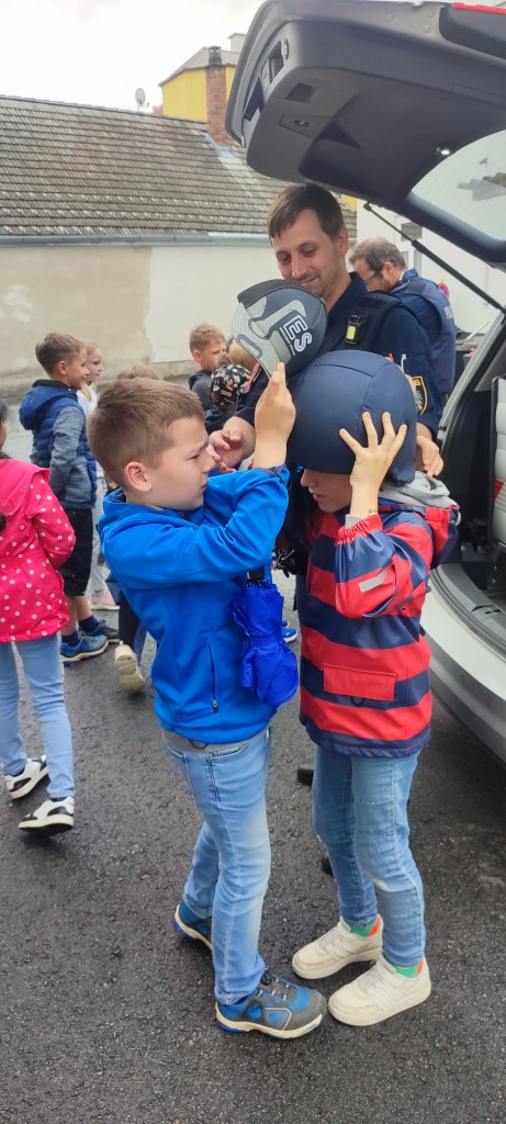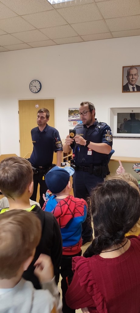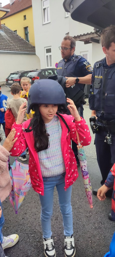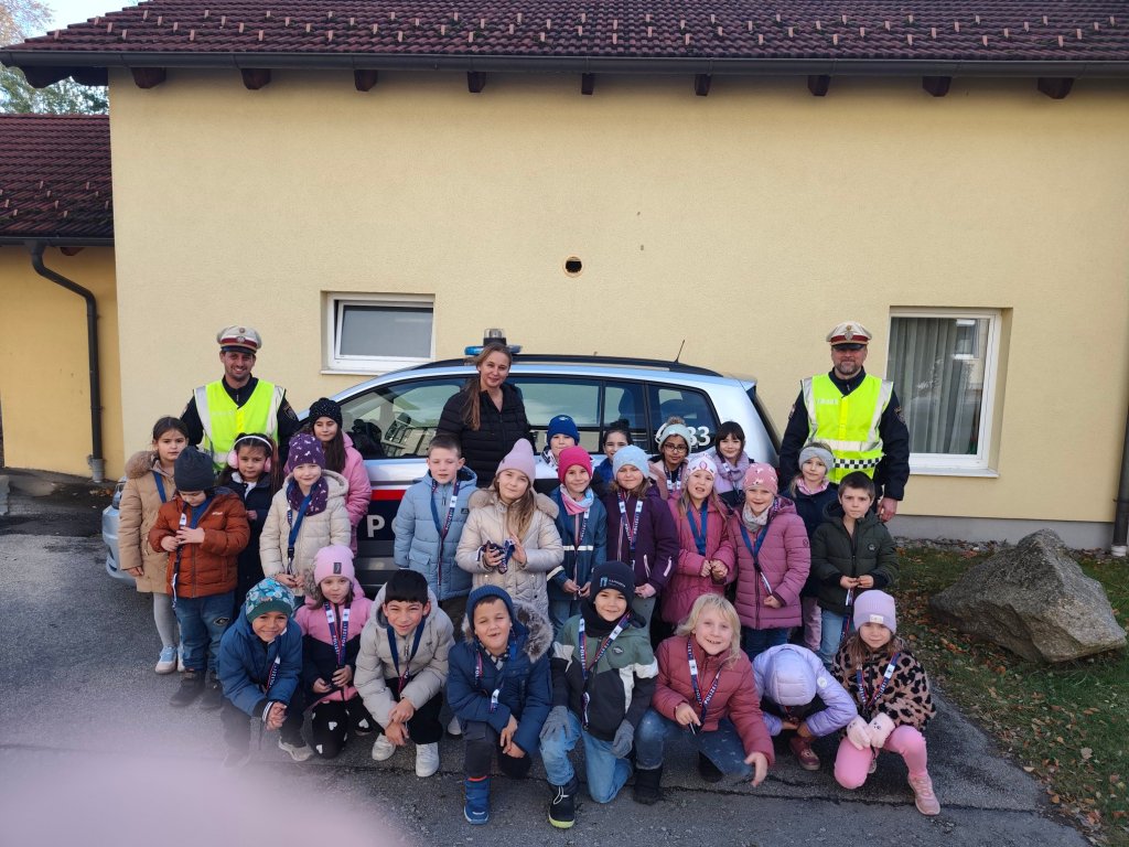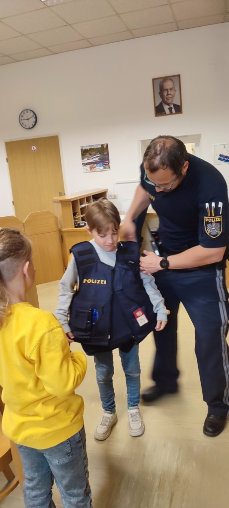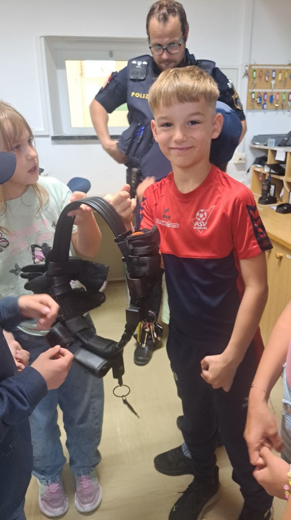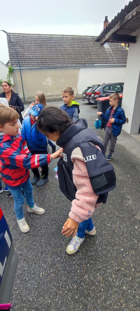 Am 24.10.25 besuchte uns die Polizei in der 1b Klasse. Zuerst gab es wichtige Informationen zum richtigen Verhalten im Straßenverkehr und danach wurde das Überqueren der Straße beim Zebrastreifen vor der Landesberufsschule geübt. Alle machten eifrig mit und lernten viel. Am Ende des interessanten Lehrausgangs gab es noch einen Polizei-Schlüsselanhänger als Geschenk für die motivierten Schulkinder.