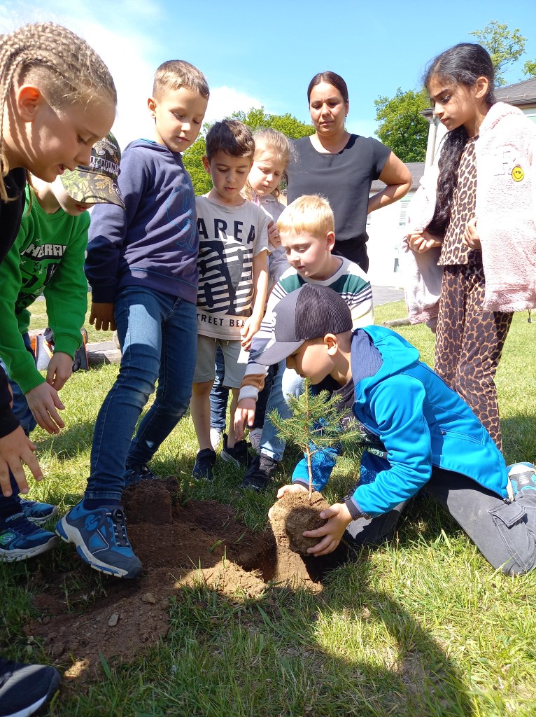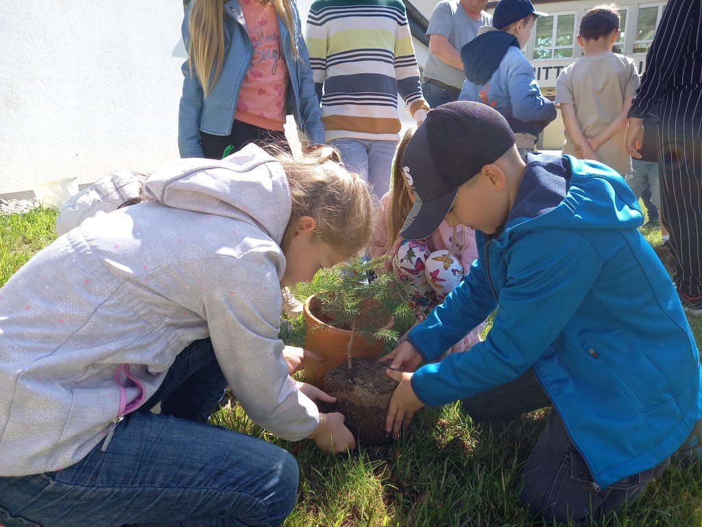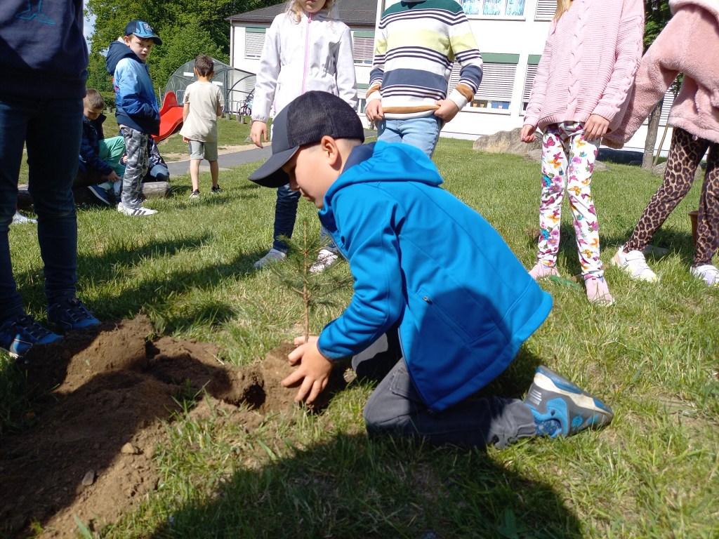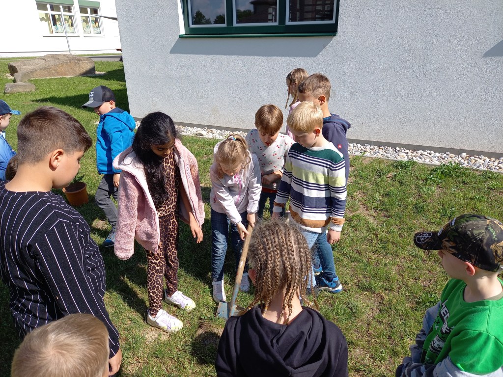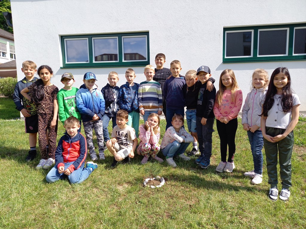 Im Herbst befassten sich die 2. Klassen mit dem Thema Wald. Ein Kind aus der 2b brachte zur Anschauung kurzerhand eine kleine Fichte von zu Hause mit. Das junge Pflänzchen wurde schnell zum „Klassenbäumchen“, gehegt und gepflegt und so gut über den Winter gebracht. Im Frühling pflanzten es die Schülerinnen und Schüler nun im Schulgarten ein und hoffen, dass es auch in Zukunft gut gedeihen wird!