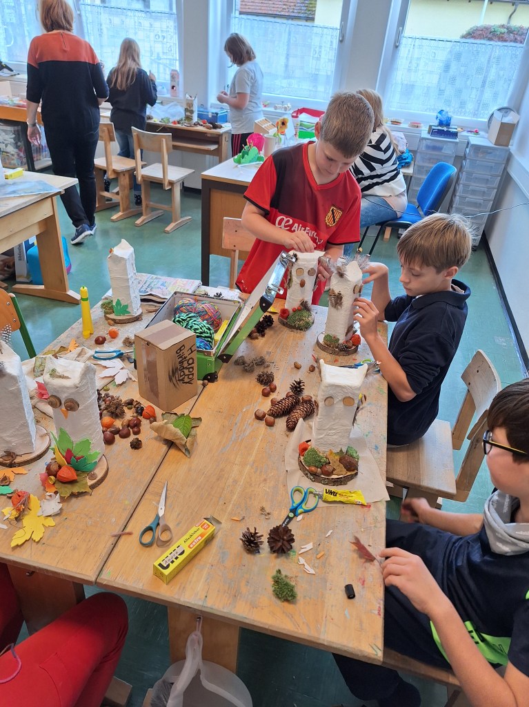 Die fleißigen Kinder haben im Werkunterricht schöne Nikolaussackerl hergestellt, die der Nikolaus pünktlich zum Nikolaustag befüllt hat. Der Elternverein brachte leckere Brioche Krampusse für alle.